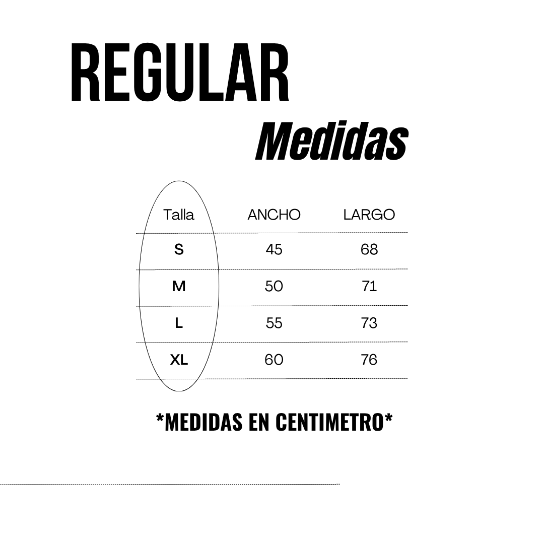 ¿Dudas con tu talla? Acá te dejamos tabla de medidas para cada fit, unicamente mide tu camiseta de frente, su largo y ancho para elegir la mejor talla para tí.